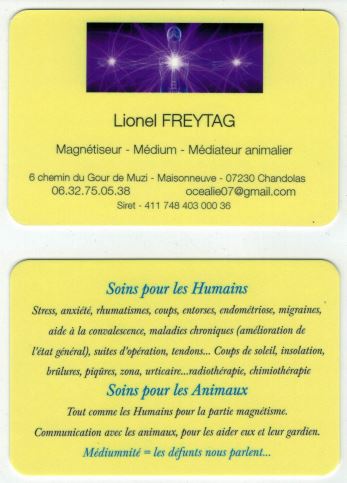 Lionel FREYTAG, mon frère de cœur, met ses différentes pratiques à votre disposition. Vous allez pouvoir bénéficier de ses « talents » et de leurs bienfaits, en tant qu’humain ou bien pour nos amis animaux. Belle rencontre.