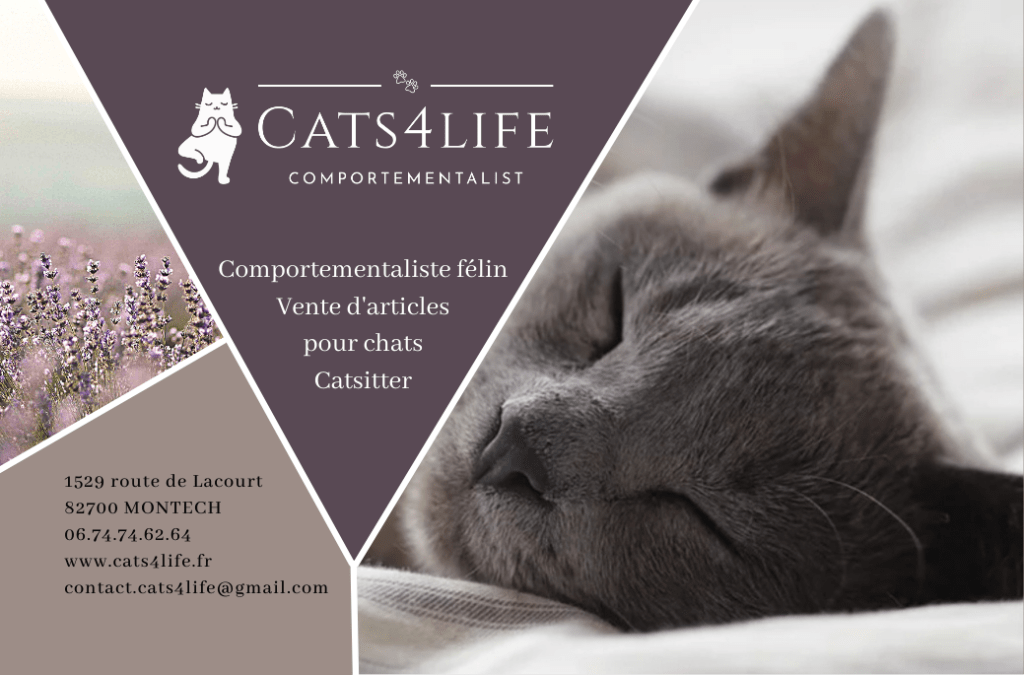 Marjorie – Comportementaliste félin. Vente d’articles pour chats-Catsitter. Une professionnelle spécialisée et dédiée à nos amis chats. Téléphone : 06 74 74 62 64 contact.cats4life@gmail.com http://www.cats4life.fr (82700 Montech)