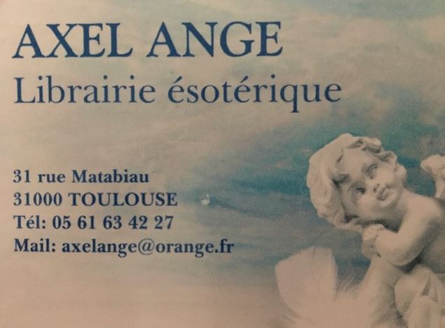 Valérie, la propriétaire du magasin et Marie-Christine, une AMA, vous accueillent dans cette boutique « angélique ». Des pierres, des encens, des accessoires, des livres et j’en passe, tout est de très belle qualité. Bienveillance avec des conseils personnalisés et de qualités. LE magasin ésotérique à Toulouse. Une référence. Tél : 05 61 63 42 27 Mail : axelange@orange.fr http://librairieaxelange.e-monsite.com/